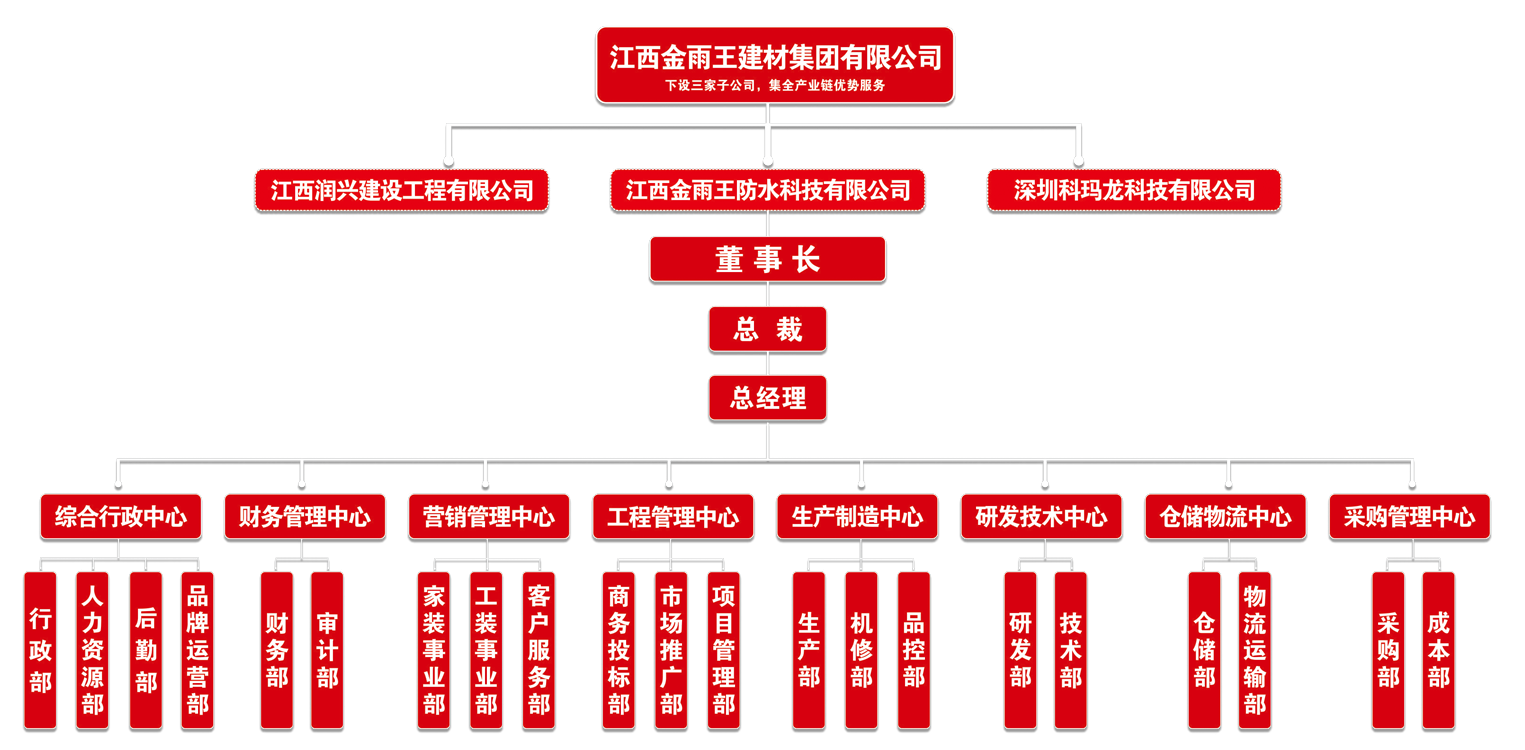 集团公司现由“江西谢氏企业管理有限公司”全资控股,下设三家子公司:“江西尊龙凯时防水科技有限公司” 、“江西润兴建设工程有限公司”、“深圳科玛龙科技有限公司” 。